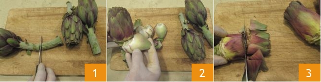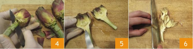 und den äußeren Teil des Stiels 4, um das zarte Innere zu bewahren. Jetzt, wo Sie das Herz der Artischocke erreicht haben, teilen Sie es in zwei gleiche Teile, entfernen Sie mit einem kleinen Messer die innere zentrale Behaarung, genannt Bart 5, und schneiden Sie die Artischocken in dünne Scheiben 6