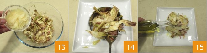 Pressen Sie 30 g Zitronensaft 10 und fügen Sie ihn zu 60 g Olivenöl hinzu 11, salzen, pfeffern und mischen Sie die Emulsion mit einem Schneebesen. Gießen Sie die Artischocken in eine Schüssel und würzen Sie sie mit der Citronette 12,