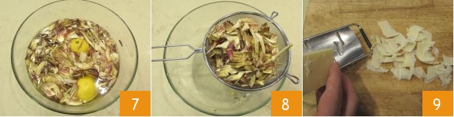 und legen Sie sie nach und nach in die Schüssel mit angesäuertem Wasser, während Sie sie schneiden 7. Sobald die Reinigung abgeschlossen ist, lassen Sie sie in einem Sieb abtropfen 8. In der Zwischenzeit bereiten Sie die Würzung vor: Reiben Sie den Grana Padano mit einer Reibe in Flocken 9 und stellen ihn beiseite.
