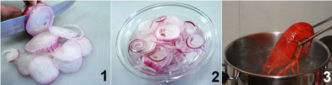 Um den katalanischen Hummer zuzubereiten, beginnen Sie damit, die rote Zwiebel 1 (am besten aus Tropea) in dünne Ringe zu schneiden und legen Sie sie für mindestens 20 Minuten in eine mit Wasser 2 und einem Esslöffel Essig bedeckte Schüssel.