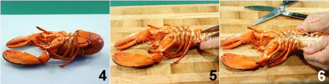 Nehmen Sie den Hummer aus dem Topf und legen Sie ihn auf das Schneidebrett 4; mit Hilfe eines Geflügelschere schneiden Sie den Panzer des Hummers 5 entlang des Bauches über die gesamte Länge auf, spreizen Sie dann den Panzer auseinander und nehmen Sie das gesamte Fleisch heraus. 6