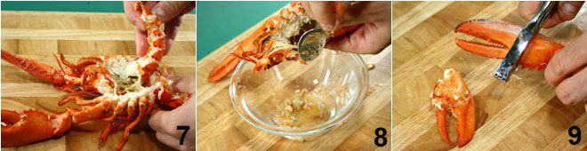Sobald der Hummer in zwei Teile geöffnet ist 7, schneiden Sie das Hummerfleisch in Scheiben, während Sie mit dem passenden Werkzeug oder, wenn nicht vorhanden, mit einem Nussknacker (8-9) die Schalen der Scheren brechen und das gesamte innere Fleisch herausnehmen (es wird die gleiche Form wie die Scheren haben).