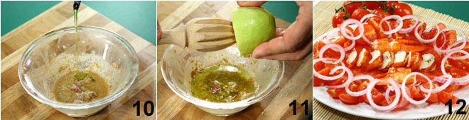 Schneiden Sie nun die Tomaten, würzen Sie sie mit Öl und Salz und legen Sie eine Schicht auf eine Servierplatte, legen Sie das in Scheiben geschnittene Hummerfleisch und die Scheren darauf, garnieren Sie mit den zuvor abgetropften Zwiebelringen und gießen Sie die vorbereitete Sauce aus Öl, Zitrone und dem mit dem Löffel gesammelten weichen Teil des Hummers darüber. 12