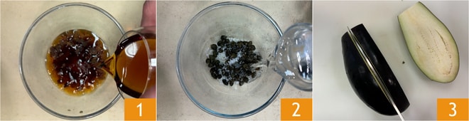 Um die Auberginen-Caponata mit Kakaosoße zuzubereiten, legen Sie zuerst die Rosinen in eine Schüssel und bedecken sie mit Marsala 1, sie sollten 30 Minuten lang hydratisieren. Weichen Sie die Kapern im Wasser 2 mindestens 10 Minuten lang ein. Waschen und schneiden Sie die Auberginen in Scheiben 3.