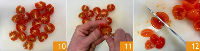 Waschen Sie die Kirschtomaten und halbieren sie 10, entfernen Sie die Samen und das Fruchtfleisch 11 und schneiden sie dann in Viertel 12.