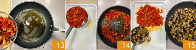 Geben Sie das Öl in eine Pfanne und fügen die Paprika hinzu 13, braten Sie sie 10 Minuten lang und legen sie dann auf Küchenpapier 14. Geben Sie die Auberginen in die Pfanne, frittieren Sie sie nach und nach bei hoher Hitze, rühren Sie wenig, bis eine knusprige Kruste entsteht, und legen sie dann auf Küchenpapier 15.