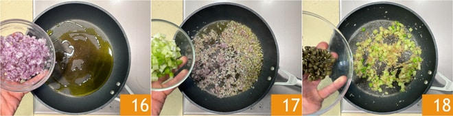 Geben Sie das Öl in eine Pfanne, fügen die Zwiebeln 16, den Sellerie 17 hinzu und braten einige Minuten an. Fügen Sie die gut ausgedrückten Kapern hinzu 18.