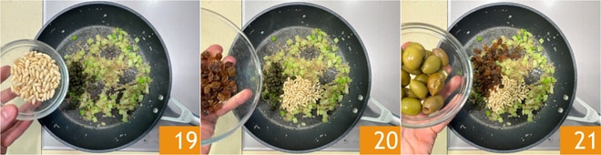 Fügen Sie auch die Pinienkerne hinzu 19, rühren Sie um, um sie zu rösten. Fügen Sie dann die Rosinen 20 und die Oliven hinzu 21. Rühren Sie um und lassen sie einige Minuten kochen.