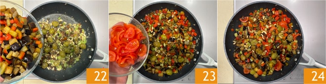 Schalten Sie die Hitze aus und fügen in der Pfanne die Auberginen, die Paprika 22 und die Kirschtomaten hinzu 23. Würzen Sie mit Salz und Pfeffer, rühren Sie um, um die Zutaten zu würzen und zu vermischen 24.