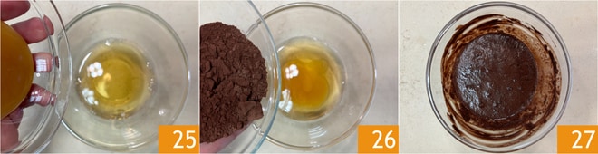 Geben Sie den Weißweinessig in eine Schüssel, fügen den Orangenblütenhonig 25 und den ungesüßten Kakao hinzu 26. Rühren Sie, bis eine homogene Mischung entsteht 27.