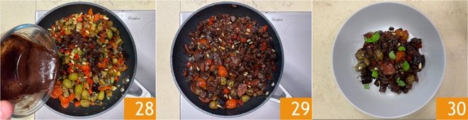 Gießen Sie die Mischung in die Pfanne 28, schalten Sie die Hitze ein, rühren Sie um und lassen Sie sie 3-4 Minuten kochen 29, dann lassen Sie sie mindestens eine Stunde ruhen. Die Auberginen-Caponata mit Kakaosoße ist fertig, garnieren Sie mit Basilikumblättern und servieren Sie 30.