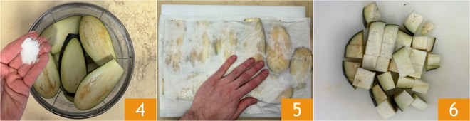 Salzen Sie die Auberginenscheiben 4 für 30 Minuten. Tupfen Sie sie dann mit Küchenpapier ab 5 und schneiden sie in Würfel 6.