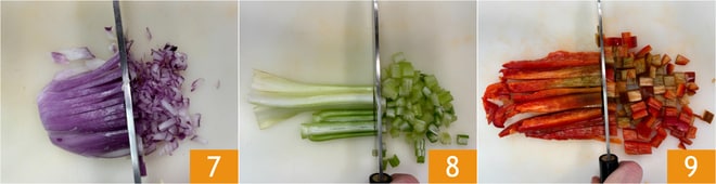 Schälen Sie die Zwiebel und hacken Sie sie mit einem Messer 7. Waschen Sie den Sellerie und schneiden ihn in Würfel 8. Reinigen Sie eine Paprika, entfernen Sie den Stiel und die inneren Samen, waschen Sie sie und schneiden sie zuerst in Streifen und dann in Würfel 9.