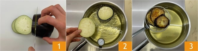 Um die Auberginen-Tacos zuzubereiten, entfernen Sie zuerst den Stiel der Aubergine und schneiden Sie sie in Scheiben von etwa 1 cm Dicke 1. Erhitzen Sie das Pflanzenöl auf eine Temperatur von 170°-175°, tauchen Sie 2-3 Auberginenscheiben gleichzeitig ein 2 und frittieren Sie sie bis zur goldenen Farbe 3. Lassen Sie sie auf Küchenpapier abtropfen und legen Sie sie beiseite.