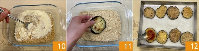 Rühren Sie, um alles zu vermischen 10, und tauchen Sie dann die frittierten Auberginen in die Mischung, dabei darauf achten, dass beide Seiten bedeckt sind 11. Legen Sie die Auberginen nach und nach auf ein mit Backpapier ausgelegtes Blech und verteilen Sie einen Teelöffel Tomatensoße 12.