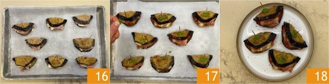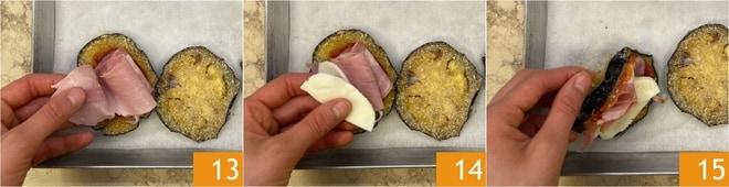 Fügen Sie eine Scheibe Schinken 13 und eine Scheibe Mozzarella hinzu 14. Falten Sie die Aubergine in der Mitte und fixieren Sie sie mit einem Zahnstocher 15.