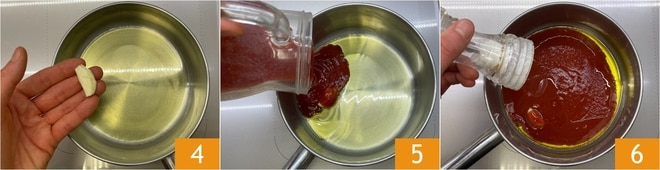 Jetzt kümmern Sie sich um die Soße: Erhitzen Sie in einem kleinen Topf etwas Öl mit einer Knoblauchzehe 4, geben Sie dann die Tomatenpassata hinzu 5 und salzen Sie 6.