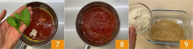 Verleihen Sie mit ein paar Basilikumblättchen Duft 7, rühren Sie um und kochen Sie bei mittlerer bis niedriger Hitze für 5-10 Minuten 8. In der Zwischenzeit schneiden Sie den Mozzarella in Scheiben, dann bereiten Sie die Panade vor, indem Sie Semmelbrösel und Parmesankäse in eine Auflaufform geben 9.