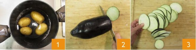Um die Auberginen aus dem Ofen mit Kartoffeln zuzubereiten, bringen Sie zunächst die Kartoffeln für etwa 20 Minuten zum Kochen 1: Sie sollten fest bleiben. In der Zwischenzeit die Aubergine 2 abschneiden und in etwa 5 mm dicke Scheiben schneiden 3.