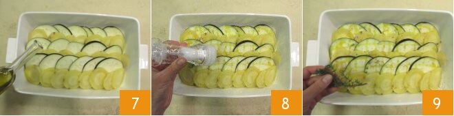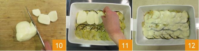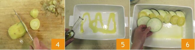 Nach der Kochzeit der Kartoffeln, schälen Sie sie und schneiden Sie sie ebenfalls in etwa 5 mm dicke Scheiben 4. Ölen Sie dann eine Auflaufform 5 und legen Sie eine erste Reihe Auberginen hinein, die Scheiben leicht überlappend. Fahren Sie mit einer Reihe Kartoffeln fort, die Sie teilweise auf die Auberginen legen, und wechseln Sie die beiden Zutaten ab, bis sie aufgebraucht sind 6.