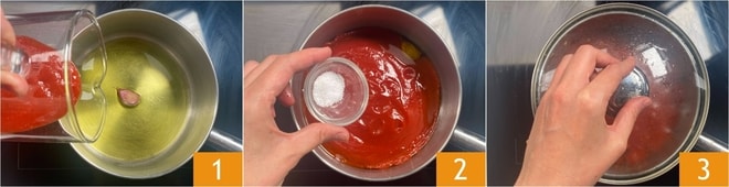 Um die Auberginenbällchen in Soße zuzubereiten, beginnt mit der Tomatensoße: Erhitzt das Öl in einem kleinen Topf mit einer ungeschälten Knoblauchzehe, dann gebt das Passata hinzu 1 und so viel Wasser, wie nötig ist, um die Karaffe auszuspülen, dann fügt das Salz hinzu 2. Rührt um und lasst es bei schwacher Hitze mit Deckel für 30-40 Minuten köcheln 3.