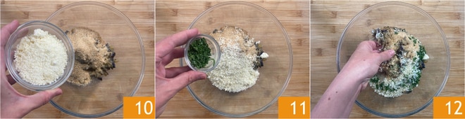 Fügt auch den geriebenen Grana Padano DOP 10 und die gehackte Petersilie hinzu 11, dann würzt mit Salz und Pfeffer. Knetet alles mit den Händen zu einer weichen und kompakten Masse 12.