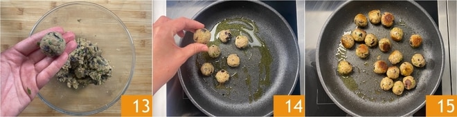 Formt etwa walnussgroße Bällchen; mit dieser Menge werden es etwa zwanzig Stück 13. Um euch dabei zu helfen, könnt ihr eure Hände anfeuchten. Erhitzt einen weiteren Schuss Öl in derselben Pfanne, in der ihr die Auberginen gekocht habt, dann legt die Bällchen hinein 14 und bratet sie etwa 5 Minuten an, indem ihr die Pfanne bewegt, um sie von allen Seiten zu bräunen 15.