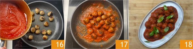 Wenn sie gleichmäßig gebräunt sind, fügt die Tomatensoße hinzu 16 und schwenkt alles kurz, um die Bällchen mit der Soße zu vermengen 17. Garniert mit Basilikumblättern und serviert eure Auberginenbällchen in Soße 18!
