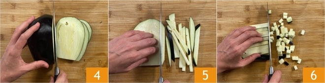 In der Zwischenzeit bereitet die Auberginen vor: Schneidet sie zuerst in Scheiben 4, dann in Stäbchen 5 und schließlich in Würfel 6.