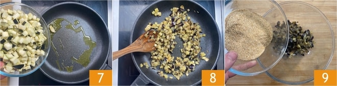 In einer antihaftbeschichteten Pfanne bratet die zerdrückte Knoblauchzehe mit einem Schuss Öl an, dann fügt die Auberginen 7 und das Salz hinzu. Bratet die Auberginen bei starker Hitze für etwa 10 Minuten an, indem ihr oft umrührt 8. Wenn sie weich und gebräunt sind, gebt die Auberginen in eine Schüssel und lasst sie abkühlen. Sobald sie abgekühlt sind, fügt das Paniermehl hinzu 9.