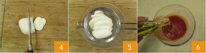 In der Zwischenzeit schneidet ihr die Mozzarella in Scheiben 4 und lasst sie abtropfen 5. Würzt das Tomatenpüree mit Öl und Salz 6.