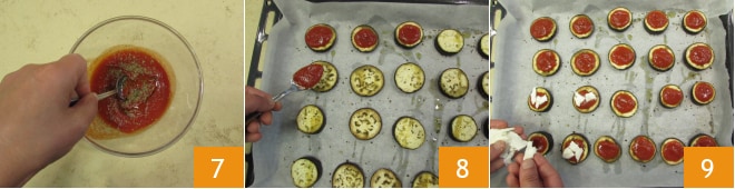 Mischt 7 und wenn die Auberginen vorgekocht sind, würzt sie und lasst etwas Platz zu den Rändern 8. Zerrupft mit den Händen die Mozzarella über die gewürzten Scheiben 9.
