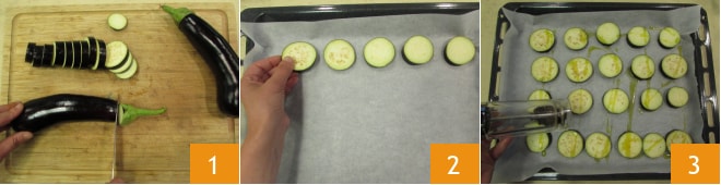 Um die Auberginenpizzetten zuzubereiten, beginnt ihr damit, die Auberginen zu säubern und sie in Scheiben von etwa 1 cm zu schneiden 1. Legt sie nach und nach auf ein Backblech mit einem Blatt Backpapier 2 und würzt sie dann mit Öl, Salz und Pfeffer 3. Backt sie für 15 Minuten im vorgeheizten Umluftofen bei 190°.
