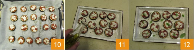 Backt sie weitere 7 Minuten 10. Garniert die Auberginenpizzetten mit einem Schuss Öl 11, Oregano und einigen Basilikumblättern 12.
