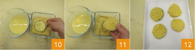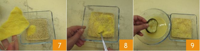 und dann in die Mischung aus Paniermehl und Maismehl 10, zuerst auf der einen Seite und dann auf der anderen 11. Wiederholen Sie dies für 4 Auberginenscheiben, wobei Sie darauf achten, jede Scheibe nach dem Panieren vorsichtig auf einen Teller zu legen, auf den Sie Backpapier gelegt haben 12.