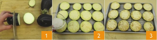 Um die Auberginenschnitzel zuzubereiten, beginnen Sie mit der Vorbereitung der Auberginen: Waschen Sie sie, entfernen Sie die Enden an beiden Seiten und schneiden Sie sie in etwa 1,5 cm dicke Scheiben, bis Sie 12 Scheiben erhalten 1. Legen Sie alle Scheiben auf ein Gitter und bestreuen Sie jede Scheibe mit grobem Salz 2. Lassen Sie sie etwa eine Stunde bei Raumtemperatur entwässern 3. In dieser Phase ist es ratsam, die Auberginen nicht länger als 1,5 Stunden ruhen zu lassen, da sie sonst zu salzig werden könnten.