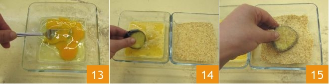 Nun zur zweiten Panade, der klassischen: Schlagen Sie in einer Schüssel ein Ei 13 und salzen Sie es leicht, dann panieren Sie eine Scheibe Aubergine, indem Sie sie zuerst in das geschlagene Ei tauchen 14 und dann in das Paniermehl 15.