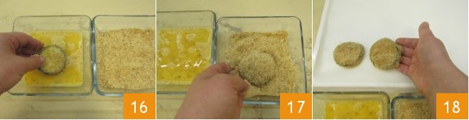 Wiederholen Sie den Vorgang für die doppelte Panade: Nachdem Sie die Scheibe in das Paniermehl getaucht haben, tauchen Sie sie erneut in das Ei 16 und dann wieder in das Paniermehl 17. Fahren Sie so fort, bis Sie 4 Auberginenscheiben haben, die Sie auf den Teller mit dem Backpapier legen 18.