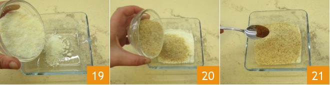 Nun zur dritten Panade: Geben Sie in eine Schüssel den Pecorino 19 und fügen Sie das Paniermehl hinzu 20. Fügen Sie den geräucherten Paprika hinzu 21