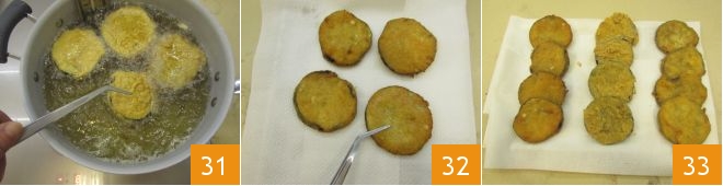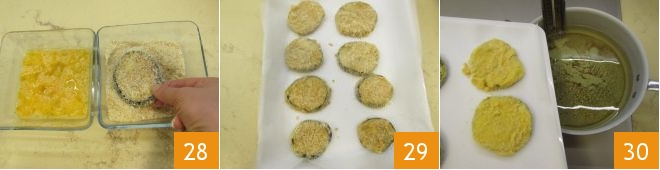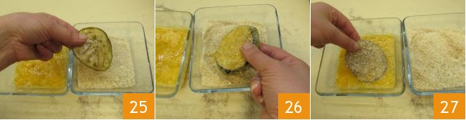 und dann in die Mischung aus Paniermehl und Pecorino 25, zuerst auf der einen Seite und dann auf der anderen 26. Auch in diesem Fall wird eine doppelte Panade gemacht: Tauchen Sie die Auberginen also erneut in das Ei 27