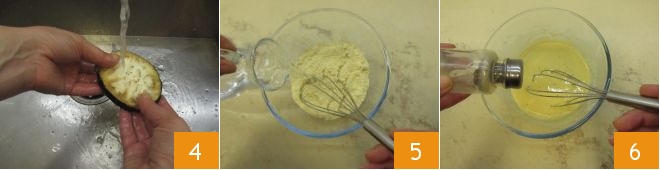 Nach dieser Zeit spülen Sie jede Scheibe gründlich unter fließendem Wasser ab, um das überschüssige Salz zu entfernen 4, und trocknen Sie sie gut mit einem sauberen Küchentuch oder Küchenpapier ab. Erhitzen Sie dann das Pflanzenöl in einem Topf mit einem Küchenthermometer und beginnen Sie, den veganen Teig zuzubereiten: Geben Sie das Kichererbsenmehl in eine Schüssel und fügen Sie das Wasser nach und nach hinzu, während Sie mit einem Schneebesen rühren, um Klumpen zu vermeiden 5. Salzen und pfeffern Sie leicht und rühren Sie erneut um 6.