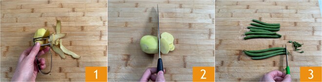 Um den Auflauf mit grünen Bohnen, Kartoffeln und Stracchino zuzubereiten, schälen Sie zunächst die Kartoffeln 1 und schneiden sie in dünne Scheiben 2; dann die Enden der grünen Bohnen abknipsen 3.