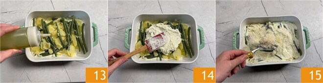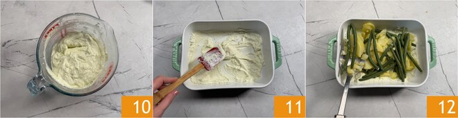 So erhalten Sie eine kompakte Sauce 10. Einen Löffel davon auf den Boden einer 25x18 cm großen Auflaufform geben 11 und die erste Schicht mit etwa der Hälfte der Kartoffeln und grünen Bohnen darauf legen 12.