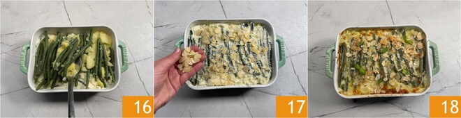 Wiederholen Sie mit einer weiteren Schicht: Kartoffeln und grüne Bohnen 16, wobei Sie darauf achten, letztere ordentlich zu platzieren und leicht mit dem Rücken eines Löffels anzudrücken, dann wieder Stracchino-Creme, den restlichen geriebenen Käse, gehobelte Mandeln, etwas Öl und eine Prise Pfeffer 17. Im vorgeheizten statischen Ofen bei 220° für etwa 20 Minuten garen. Lassen Sie es leicht fest werden, dann mit frischem Basilikum garnieren, bevor Sie Ihren Auflauf mit grünen Bohnen, Kartoffeln und Stracchino servieren 18.