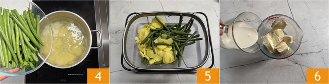 Geben Sie Kartoffeln und grüne Bohnen in kochendes Salzwasser und blanchieren Sie sie für 10 Minuten 4. Abtropfen lassen und abkühlen lassen 5. In der Zwischenzeit bereiten Sie die Stracchino-Creme vor: Geben Sie den Stracchino und die Sahne in einen Krug 6.