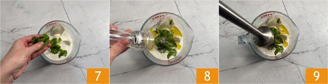 Salzen, pfeffern und mit einer Handvoll Basilikumblättern verfeinern 7, etwas Öl dazugeben 8 und mit einem Stabmixer pürieren 9.