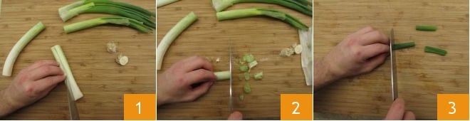 Um die Austern mit Sekt und Frühlingszwiebel zuzubereiten, beginnen Sie mit der Reinigung der Frühlingszwiebeln. Schneiden Sie den unteren Teil ab und entfernen Sie die Spitze, indem Sie dort schneiden, wo der grüne Teil (nicht wegwerfen), der härter ist, in den weißen übergeht, wo der weichere Teil beginnt. Schneiden Sie den letzteren der Länge nach auf und entfernen Sie, falls nötig, die Haut, spülen Sie das Innere ab 1. Hacken Sie es schließlich fein und geben Sie es in eine Schüssel 2. In der Zwischenzeit reinigen Sie die beiseitegelegten Stängel der Frühlingszwiebel. Dann schneiden Sie sie in Stücke von 3-4 cm 3.
