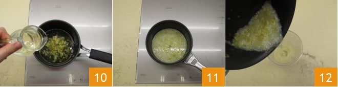 Sobald sie weich ist, gießen Sie den Sekt hinzu 10 und kochen Sie weitere 10 Minuten 11. Am Ende der Garzeit gießen Sie die Mischung in das Gefäß eines Stabmixers 12,