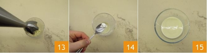 mixen Sie alles 13 und fügen Sie dann das Maisstärke hinzu und mixen Sie noch einen Moment, um das Pulver zu integrieren 14, so dass Sie ein glattes Püree erhalten; gießen Sie es in ein Gefäß und lassen Sie es abkühlen 15.