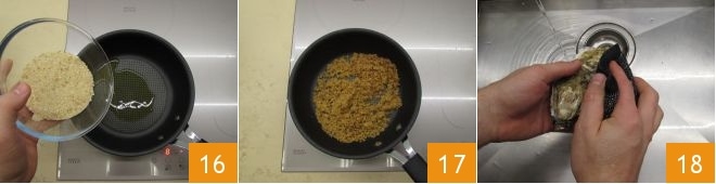Weiter zur Panade: Erhitzen Sie in einer kleinen Pfanne etwas Öl und fügen Sie die Semmelbrösel hinzu 16. Lassen Sie sie einige Minuten bei starker Hitze rösten, dabei gelegentlich umrühren, um ein Anbrennen zu vermeiden; legen Sie sie beiseite 17. An diesem Punkt, wenn Ihre nicht bereits gereinigt sind, kümmern Sie sich um die Reinigung der Austern. Verwenden Sie ein Drahtgeflecht, um die Oberfläche der Austern unter einem Wasserstrahl zu reinigen 18.